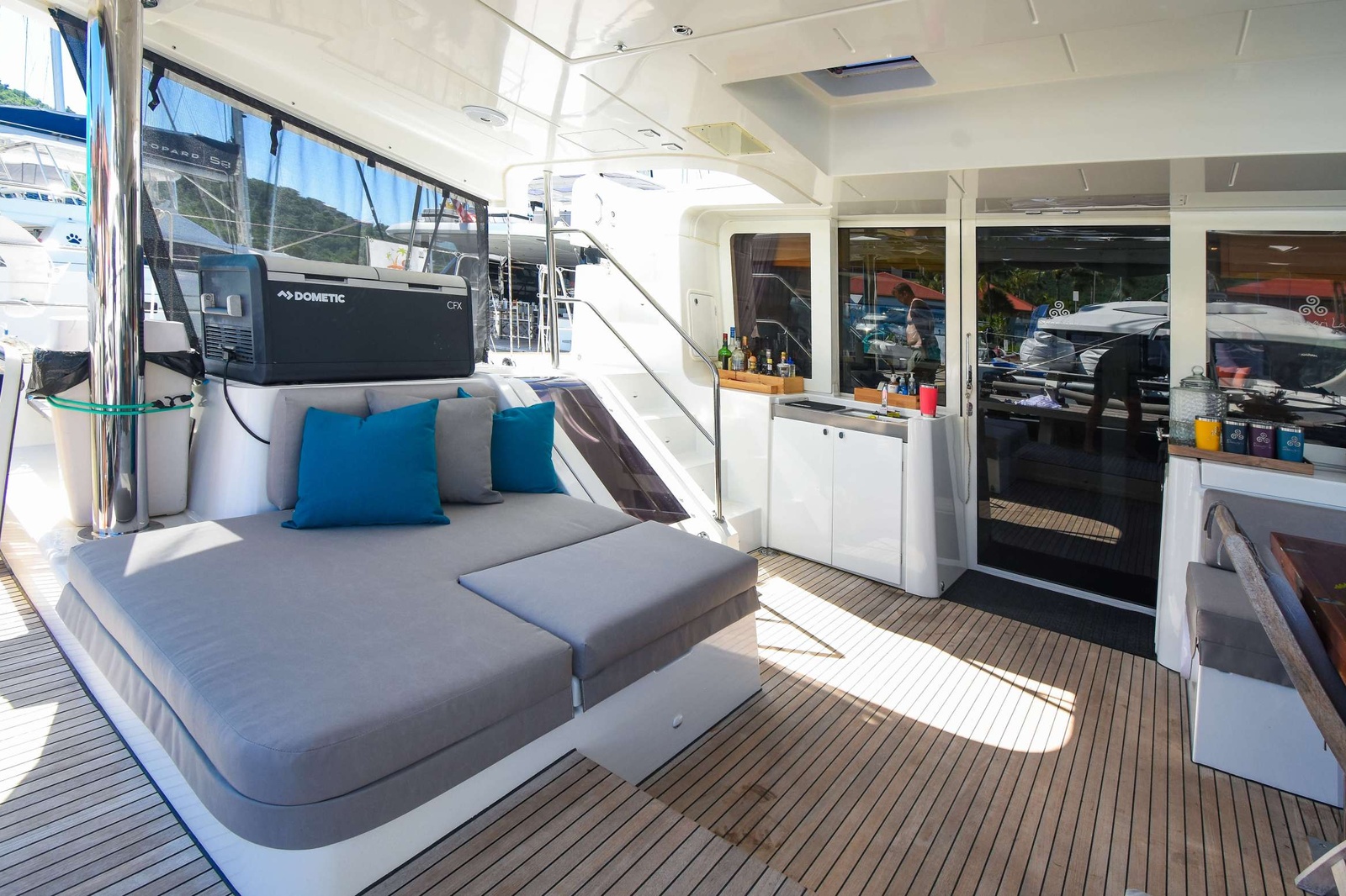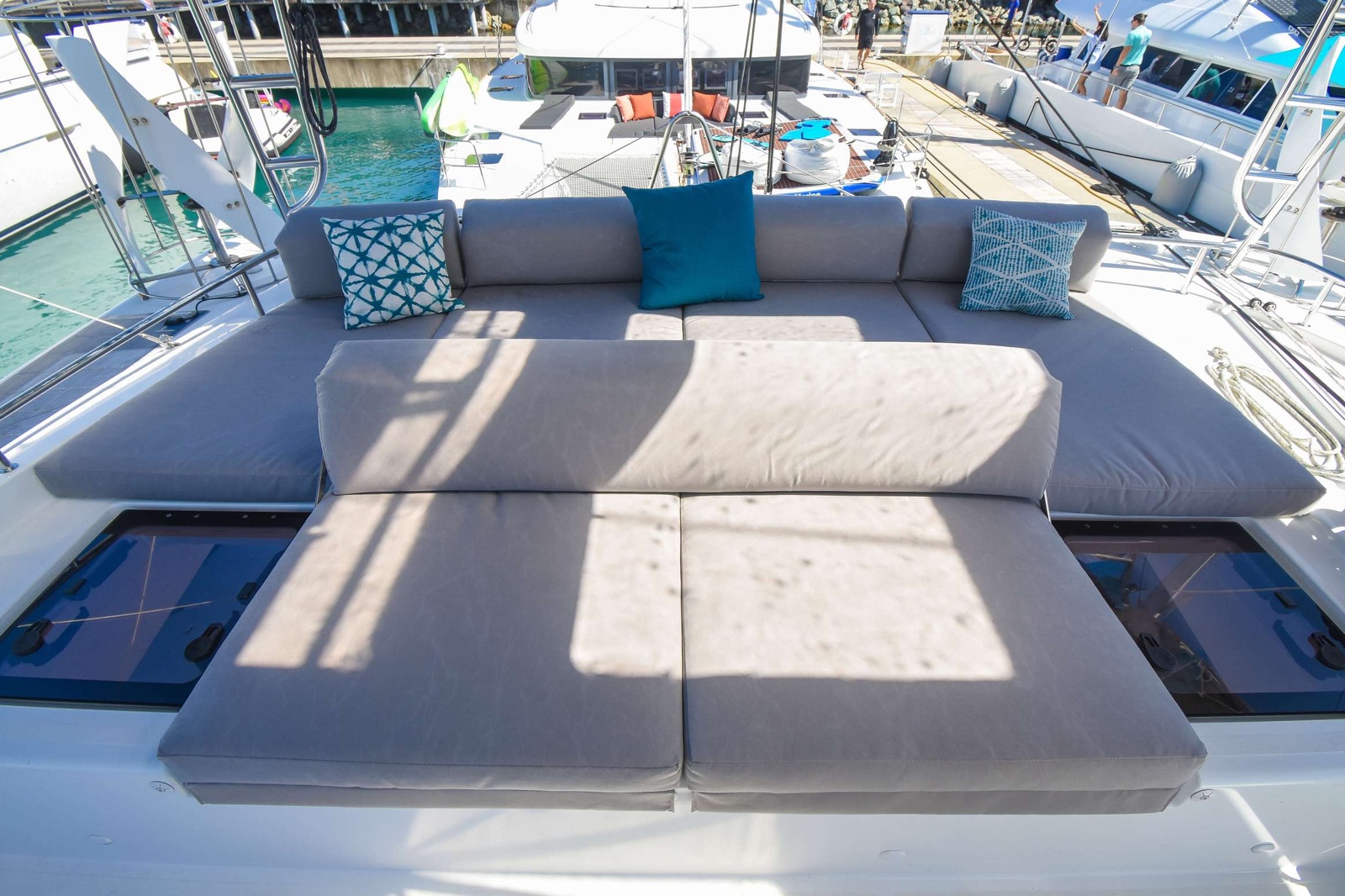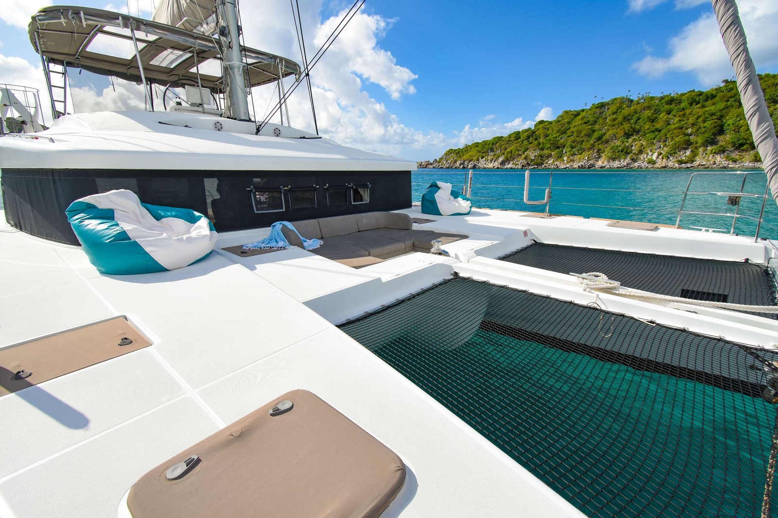 The Lagoon 52 layout connects indoor and outdoor living with multiple lounges, trampolines, and alfresco dining spaces.